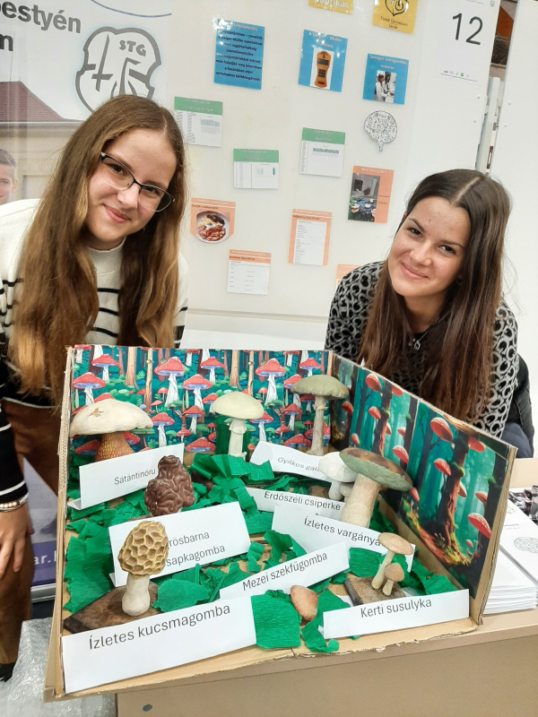 Jókor értünk a Táncsics gimi tornacsarnokába, mi voltunk az elsők, akik kirakodhattunk. Standunk a kutatásainkat bemutató poszterből, iskolai rollupból, ehető / mérgező gombapárokat illusztráló diorámából állt. Az érdeklődőknek szórólappal, kis ajándékdobozzal (csiperkegomba szárítmányt és QR-kódot tartalmazott) kedveskedtünk. Ezután volt egy kis időnk a belvárosban sétálni: mindenkinek jó szívvel ajánljuk meglátogatni a sétálóutcát, mivel nagyon hangulatos!