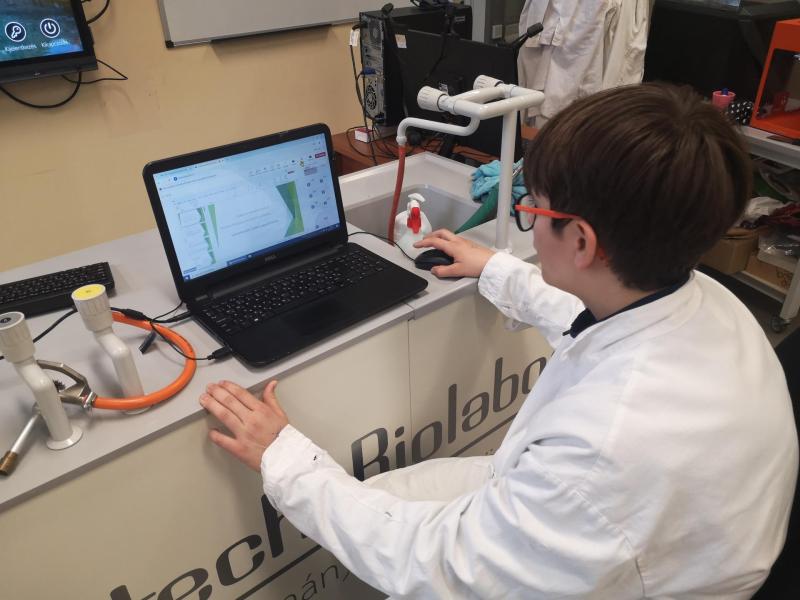 Biolabor szakkörös pályázónk, Járomi Levente először a Selye pályázaton elnyert LSK interaktív vizuál-kollaborációs és videokonferencia ökoszisztéma segítségével próbált kommunikálni, de ennek kifinomult rendszere a háttérzajokat annyira kiemelte, hogy áttértünk a mezei laptopra.