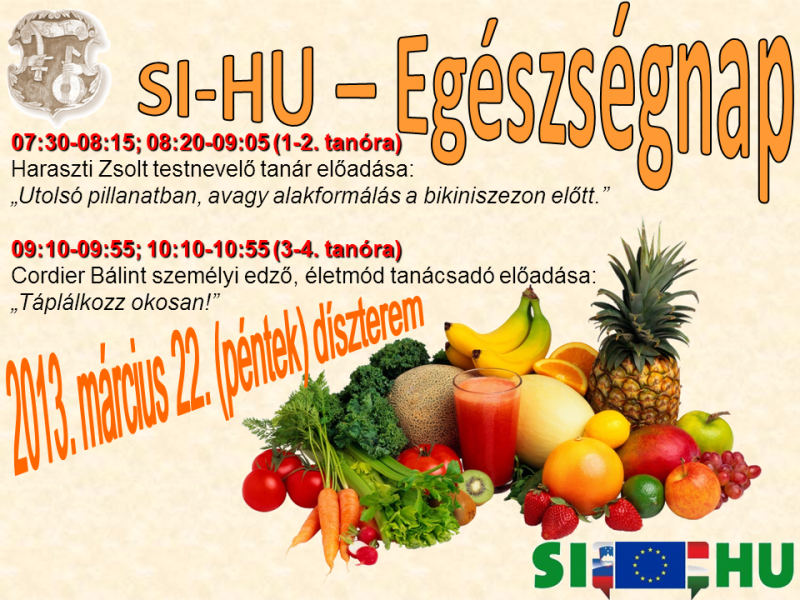 A SI-HU szlovén-magyar Európai Uniós projekt keretében került megrendezésre iskolánkban az Egészségnap című rendezvény. A programra két szakembert hívtunk meg, a gimnázium testnevelő tanárát, Haraszti Zsoltot és a Sárvári Wellness fürdő képviseletében Cordier Bálint személyi edzőt, életmód tanácsadót. A téma a fiatal korosztály körében nagy érdeklődésre tartott számot. A nap első részében Haraszti tanár úr tartotta meg előadását „Utolsó pillanatban, avagy alakformálás a bikiniszezon előtt” címmel. Beszélt a rendszeres testmozgás fontosságáról és elemezte a profi sportolók és az átlagember edzésprogramja és sportteljesítménye közti különbségeket. Az előadás végén mindenkit óvott attól, hogy ne a rövid utat válassza, ne hagyja magát becsapni a csodaszereket reklámozó hirdetések által.