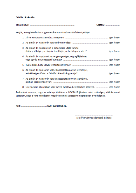 Az iskolát kizárólag egészséges, tüneteket nem mutató tanuló látogathatja.