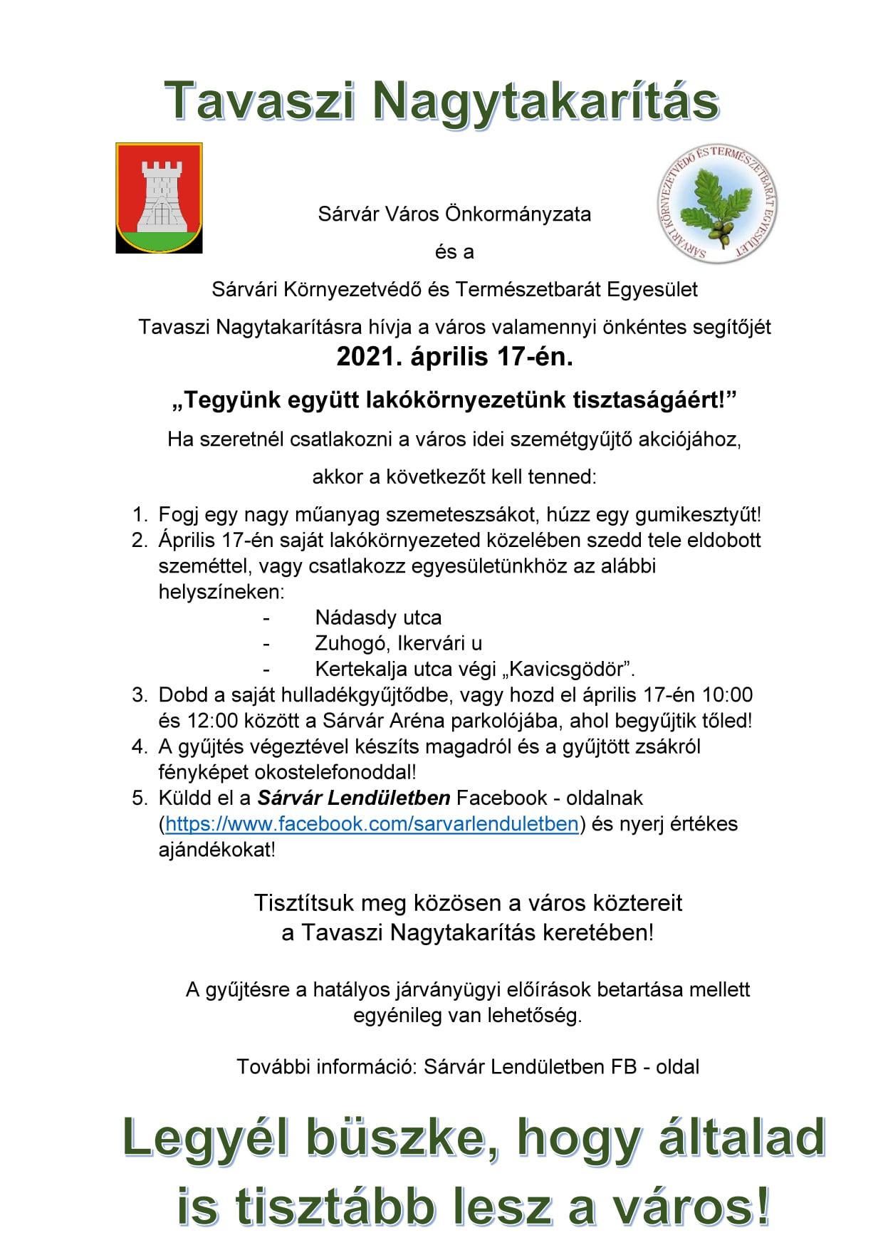 Tavaszi Nagytakarításra hívja a város valamennyi önkéntes segítőjét Sárvár Város Önkormányzata és a Sárvári Környezetvédő és Természetbarát Egyesület.